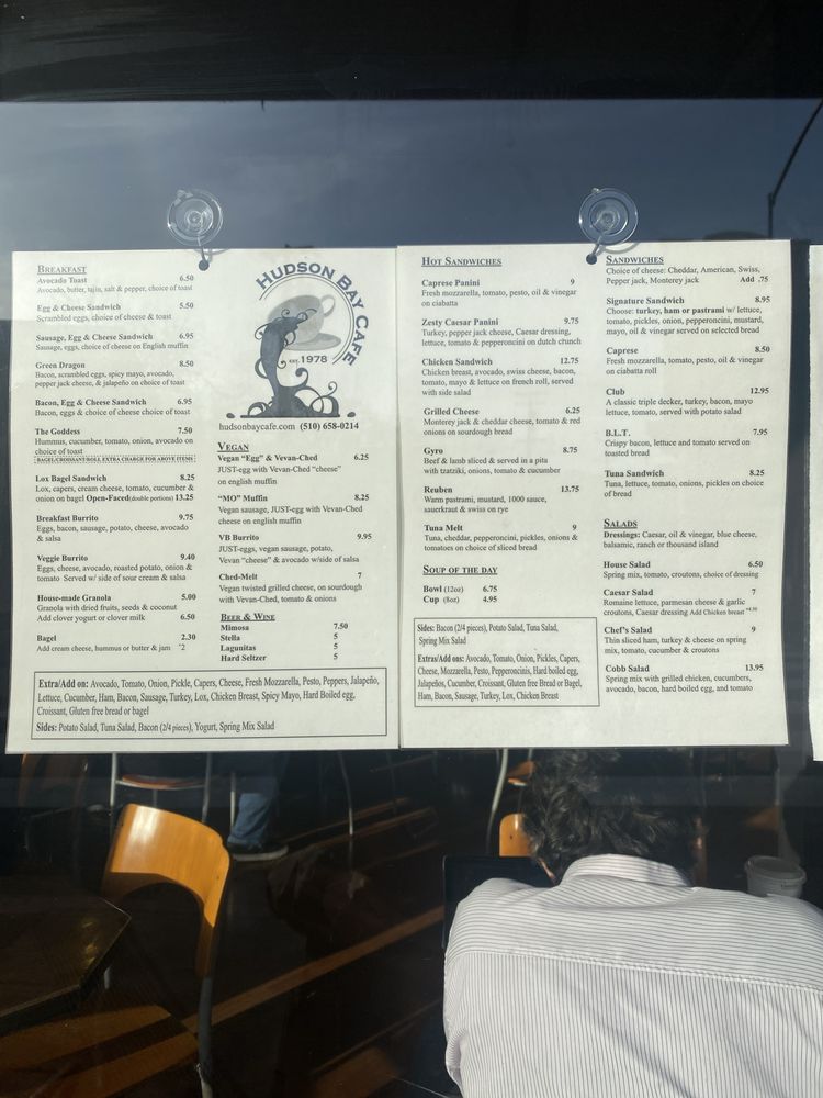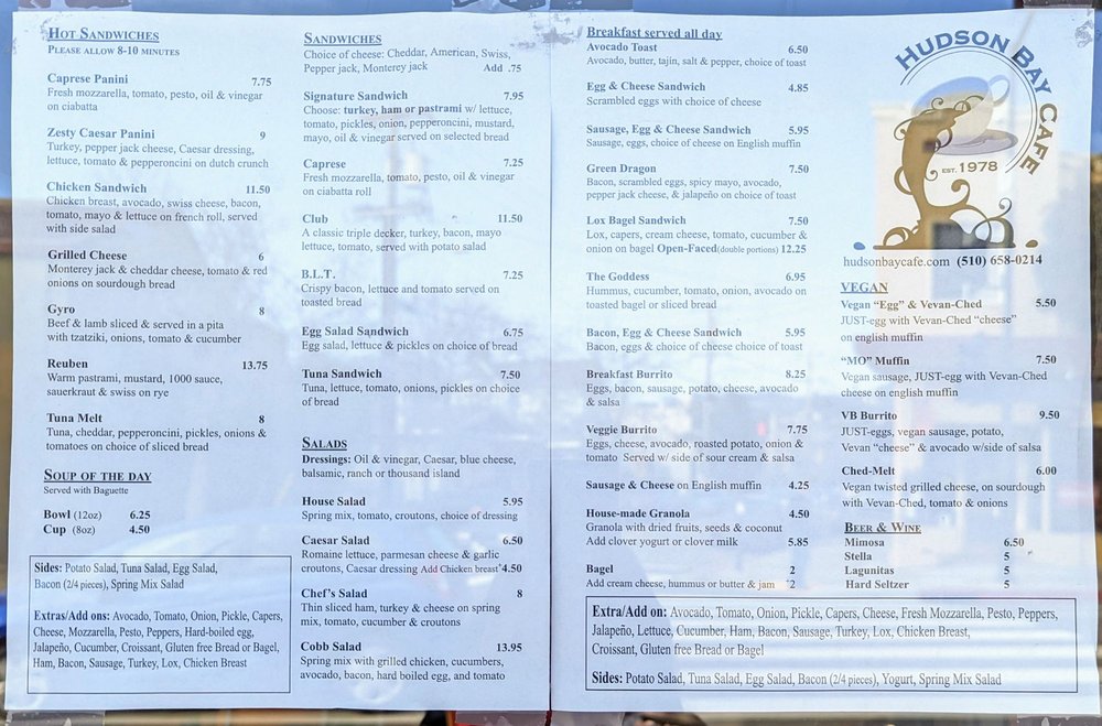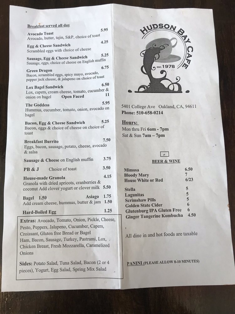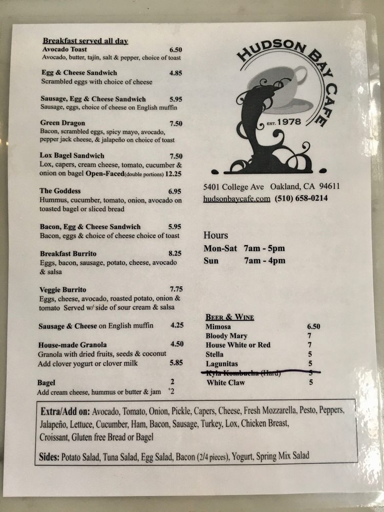 Hudson Bay Cafe, located in Oakland, CA, offers a cozy atmosphere with a range of breakfast options including Avocado Toast and Egg & Cheese Sandwiches. For vegan diners, they have a selection of delicious dishes like the Vegan Egg & VevanChed and the ChedMelt. Customers praise the cafe for its friendly staff, good coffee, and chill environment. The menu also features a variety of add-ons and sides for customization. Reviewers highlight the convenient location near public transportation, street parking, and the availability of free Wi-Fi. Whether you're looking for a quick to-go option or a place to sit and enjoy the Rockridge community, Hudson Bay Cafe is a great choice for a satisfying meal in a relaxed setting.